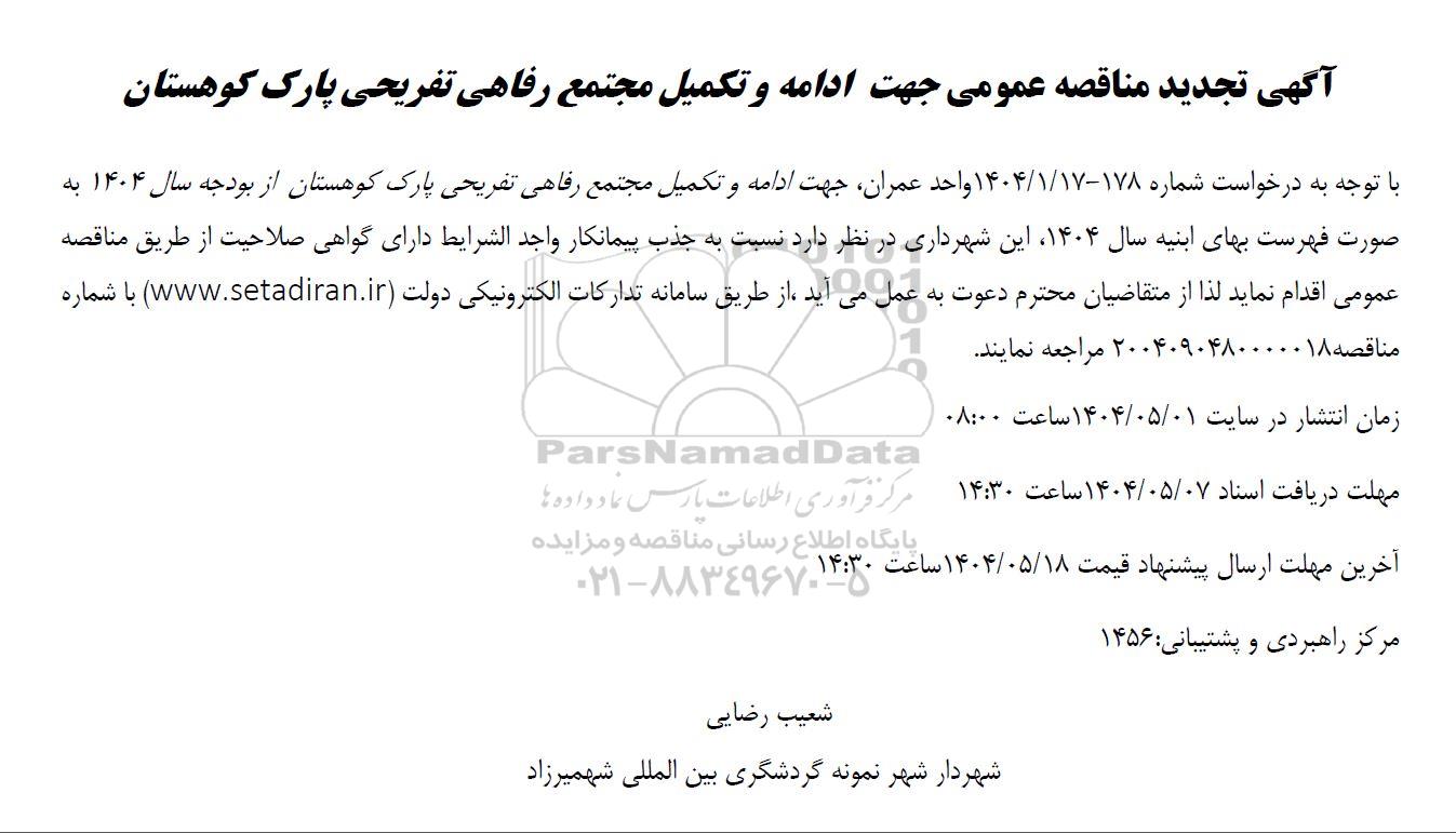 با توجه به درخواست شماره 178- 1404/1/17 واحد عمران جهت ادامه تکمیل مجتمع رفاهی تفریحی پارک کوهستان از بودجه سال 1404 و به صورت فهرست بهای ابنیه 1404 این شهرداری در نظر دارد ، نسبت به جذب پیمانکار واجد الشرایط دارای گواهی صلاحیت در رشته ابنیه از سازمان مدیریت و برنامه ریزی از طریق مناقصه عمومی اقدام نماید لذا از متقاضیان محترم دعوت به عمل می آید از طریق سامانه تدارکات الکترونیکی دولت ستاد ایران با شماره مناقصه 2004090480000018 مراجعه نمایند .