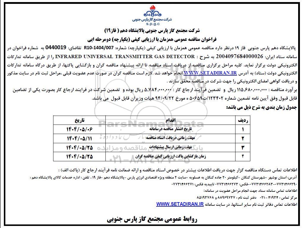 پالایشگاه دهم پارس جنوبی فاز 19 در نظر دارد مناقصه عمومی همزمان با ارزیابی کیفی (یکپارچه) شماره R10/1404/007 تقاضای 0440019 به شماره فراخوان در سامانه ستاد ایران 2004097684000026 به شرح : INFRARED UNIVERSAL TRANSMITTER GAS DETECTOR را از طریق سامانه تدارکات الکترونیکی دولت برگزار نماید. کلیه مراحل برگزاری مناقصه از دریافت اسناد مناقصه تا ارائه پیشنهاد مناقصه گران و بازگشایی پاکتها از طریق درگاه سامانه تدارکات الکترونیکی دولت (ستاد) ایران انجام خواهد شد. لازم است مناقصه گران در صورت عدم عضویت قبلی ، مراحل ثبت نام در سایت مذکور و دریافت گواهی امضای الکترونیکی را جهت شرکت در مناقصه محقق سازند .