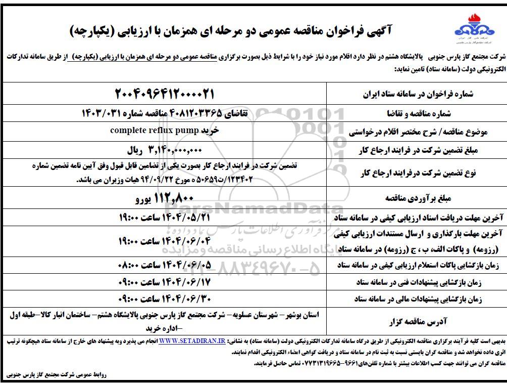 موضوع مناقصه / شرح مختصر اقلام درخواستی: خرید COMPLETE REFLUX PUMP