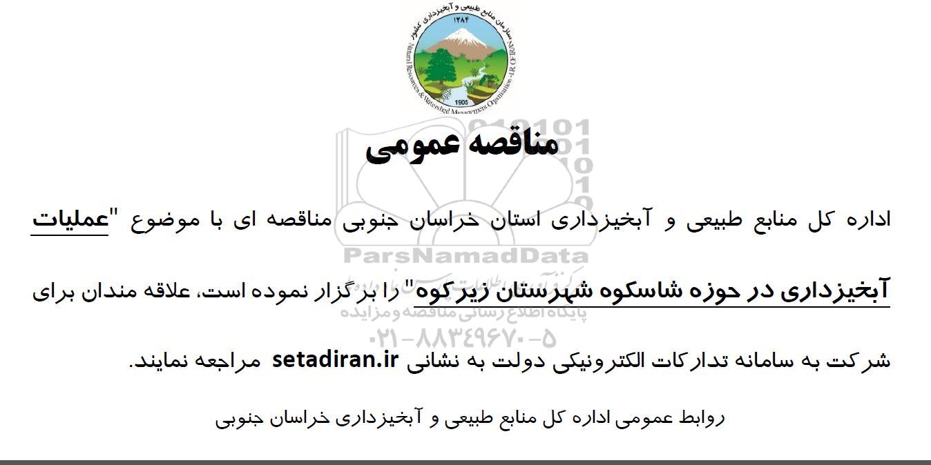 اداره کل منابع طبیعی و آبخیزداری استان خراسان جنوبی مناقصه ای با موضوع عملیات آبخیزداری در حوزه شاسکوه شهرستان زیرکوه را برگزار نموده است. علاقه مندان برای شرکت به سامانه تدارکات الکترونیکی دولت به نشانی سایت ستاد ایران مراجعه نمایند.