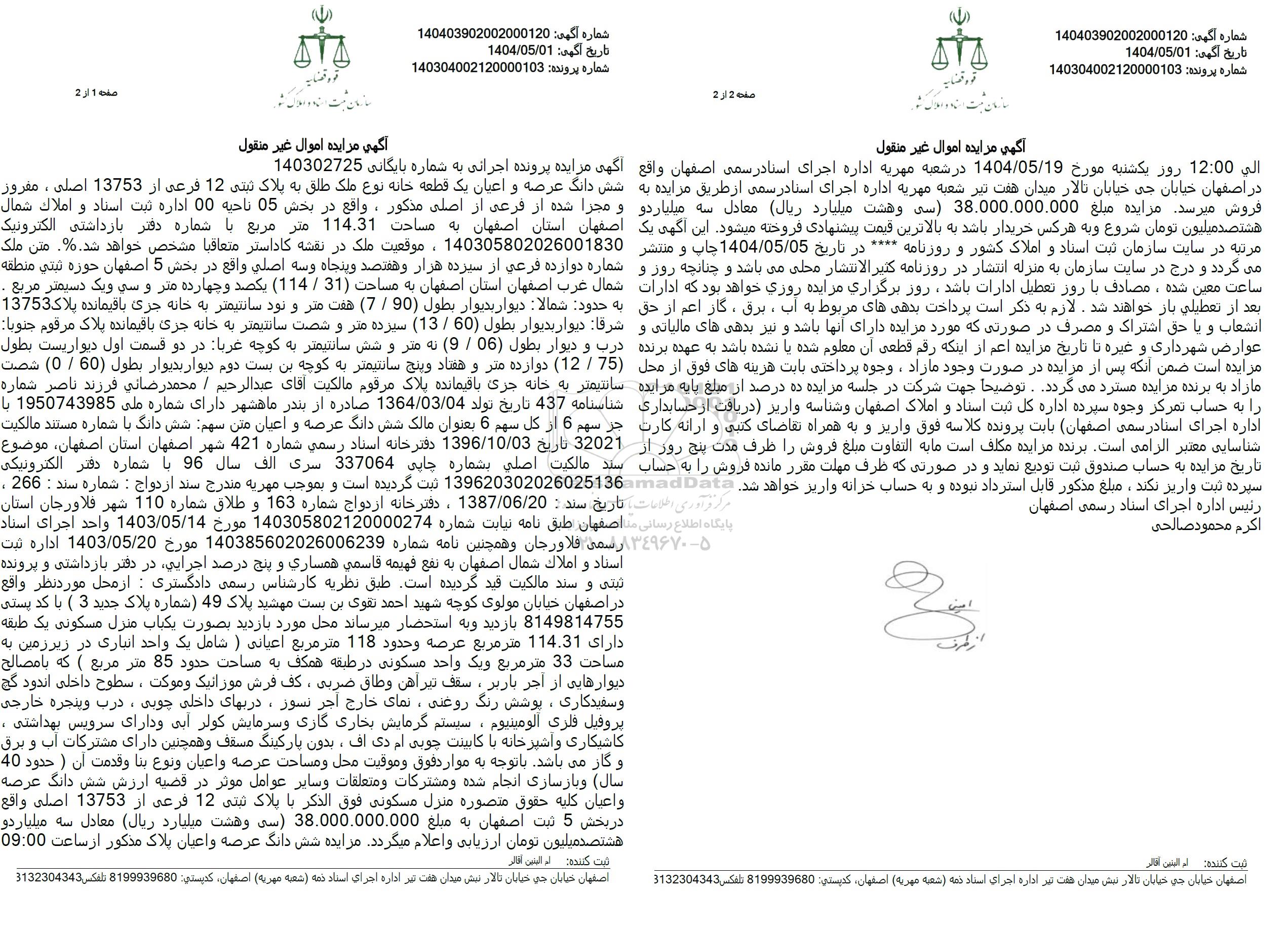 مزایده فروش ششدانگ یک قطعه خانه به مساحت 114.31 مترمربع با پلاک ثبتی 12 فرعی از 13753 اصلی, مزایده فروش ششدانگ یک قطعه خانه به مساحت 114.31 مترمربع با پلاک ثبتی 12 فرعی از 13753 اصلی
