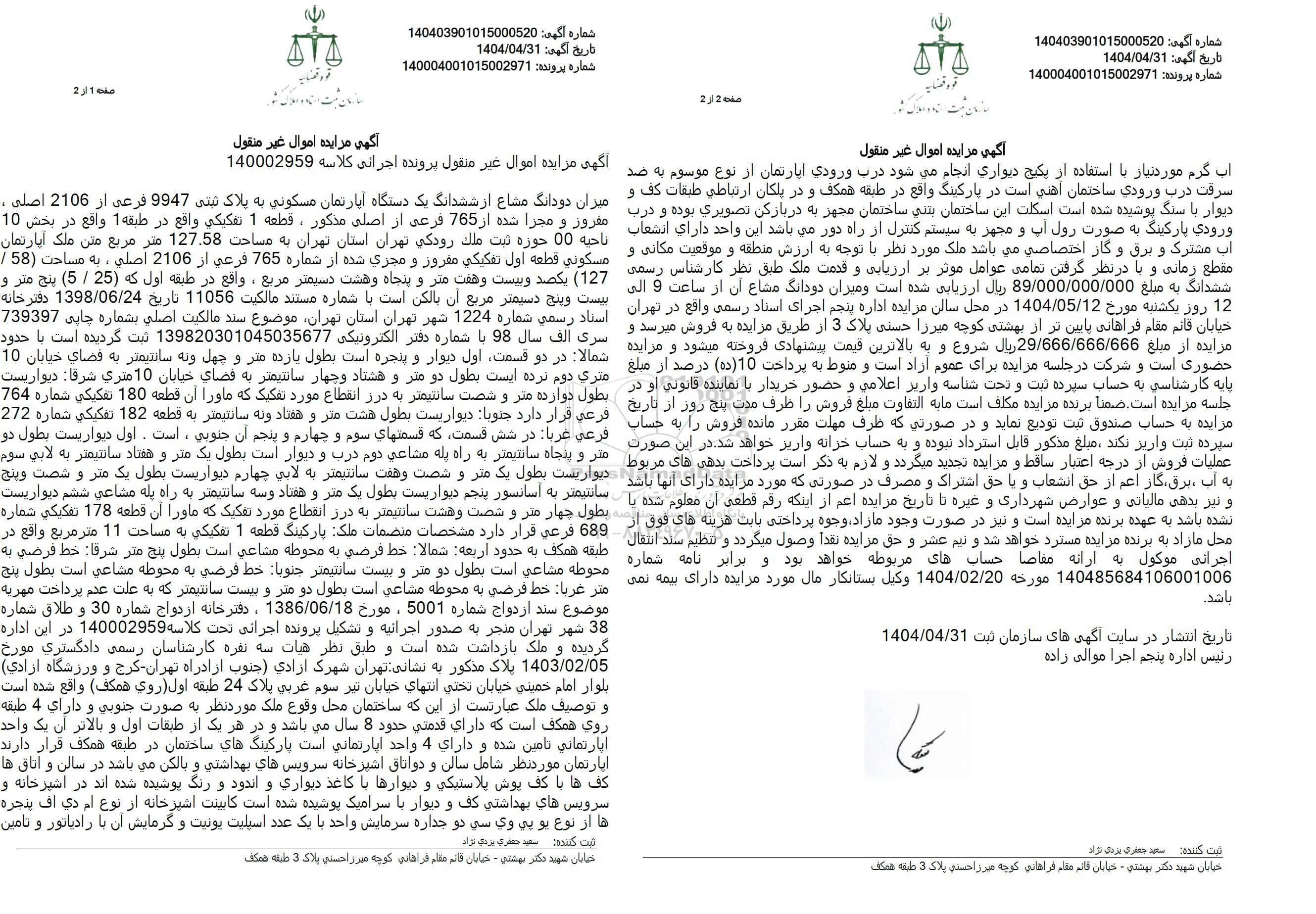 مزایده فروش یک دستگاه آپارتمان مسکونی به مساحت 127.58 مترمربع پلاک ثبتی 9947 فرعی از 2106 اصلی
