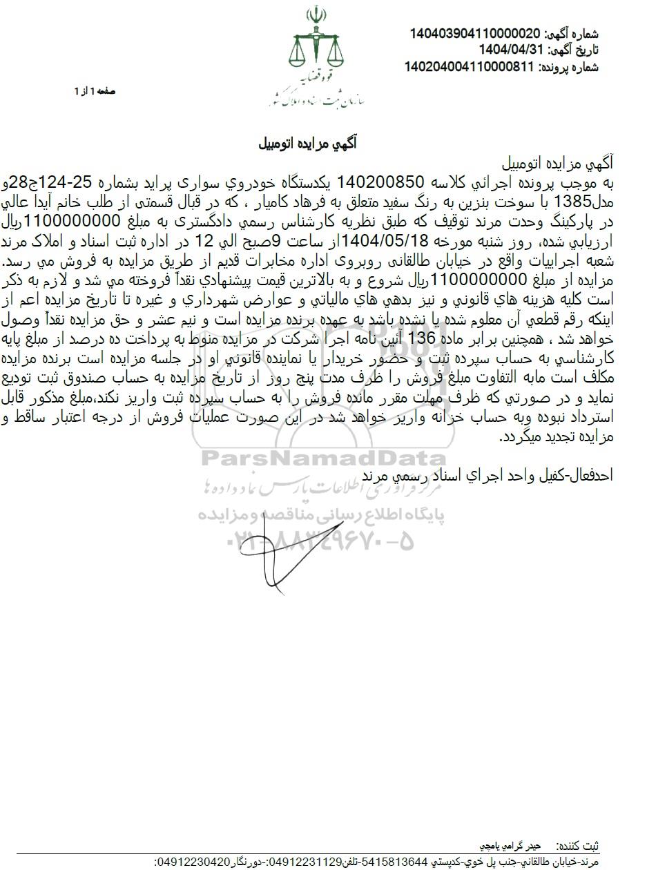 تمام آگهی ها طبق نمونه تصویر آگهی صرفا جهت اطلاع رسانی می باشد در خصوص استفاده از این آگهی هر گونه مسئولیت پرداخت به آگهی دهنده و بررسی و احراز هویت به عهده شرکت کنندگان می باشد و پایگاه خبری پارس نماد هیچگونه منفعت و مسئولیتی بابت تعهد این آگهی ندارد.