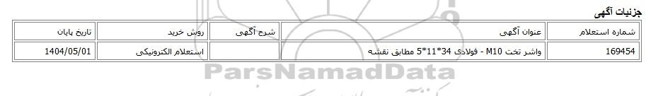 | 169454 | واشر تخت M10 - فولادی 34*11*5 مطابق نقشه | استعلام الکترونیکی | 1404/05/01 |
