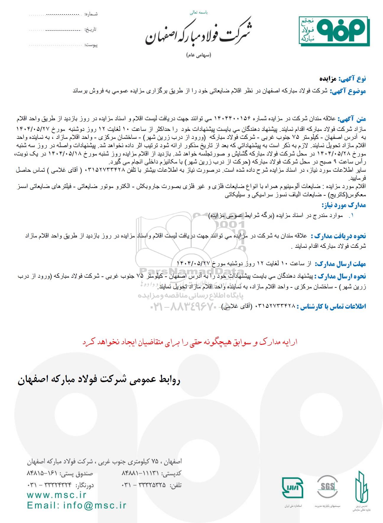 متن آگهی: علاقه مندان شرکت در مزایده شماره 1404400156 می توانند جهت دریافت لیست اقلام و اسناد مزایده در روز بازدید از طریق واحد اقلام مازاد شرکت فولاد مبارکه اقدام نمایند. پیشنهاد دهندگان می بایست پیشنهادات خود را حداکثر از ساعت 10 لغایت 12 روز دوشنبه مورخ 1404.05.27 به آدرس اصفهان - کیلومتر 75 جنوب غربی - شرکت فولاد مبارکه (ورود از درب زرین شهر) - ساختمان مرکزی - واحد اقلام مازاد ، به نماینده واحد اقلام مازاد تحویل نمایند. لازم به ذکر است به پیشنهاداتی که بعد از تاریخ مذکور ارائه شود ترتیب اثر داده نخواهد شد. پیشنهادات واصله در روز سه شنبه مورخ 1404.05.28 در محل شرکت فولاد مبارکه گشایش و صورتجلسه خواهد شد. بازدید از اقلام مزایده روز شنبه مورخ 1404.05.18 در یک نوبت، رأس ساعت 9 صبح در محل شرکت فولاد مبارکه (حرکت از درب زرین شهر) با مکانیزم داخلی انجام می گیرد.