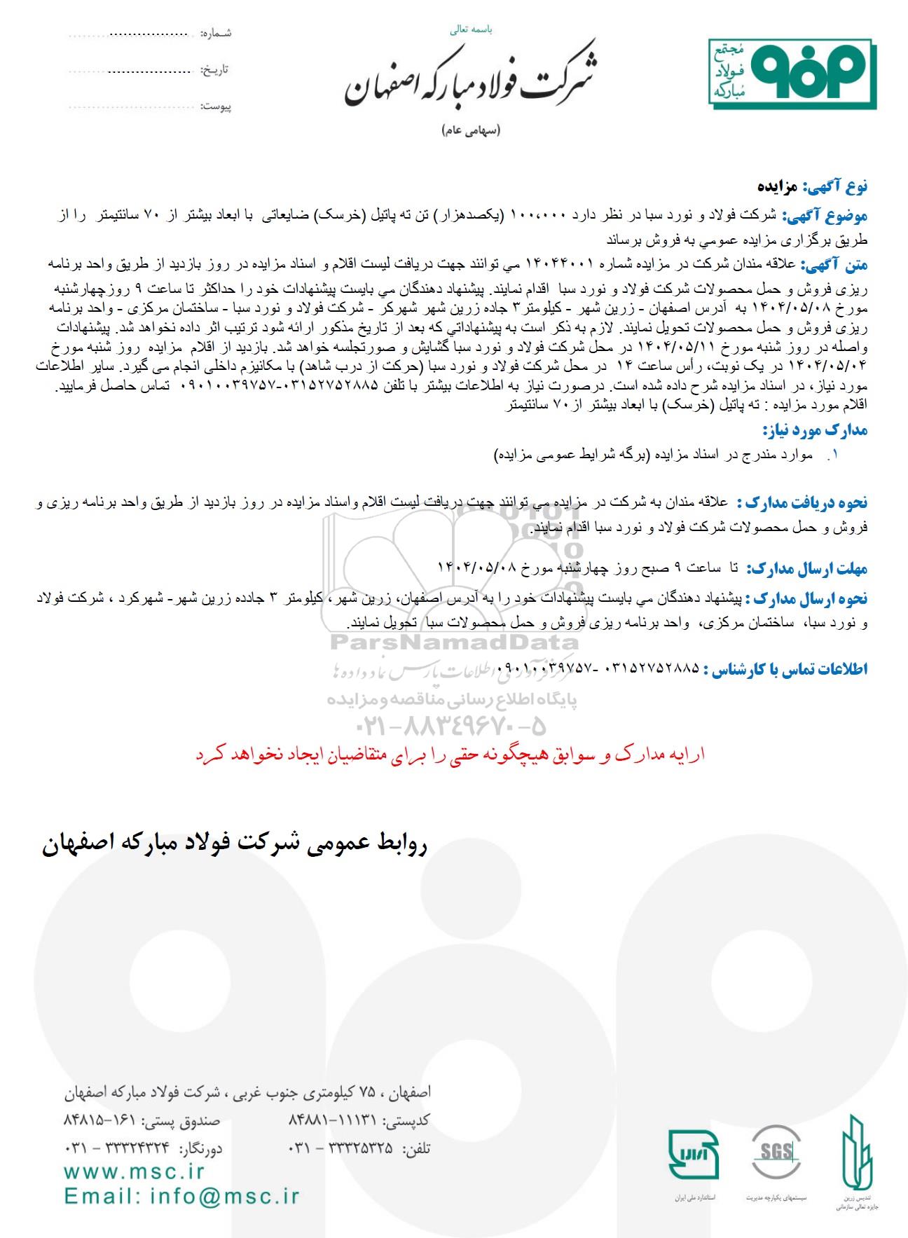 مزایده عمومی مزایده فروش 100.000 ( یکصد هزار) تن ته پاتیل (خرسک) ضایعاتی با ابعاد بیشتر از 70 سانتیمتر برگزار میگردد. از کلیه افراد متخصص و شرکتهای واجد شرایط دعوت به عمل میآید تا در این مزایده با کد خبرگزاری پارس نماد : 9315297 شرکت نمایند تاریخ شروع مزایده : 1404/04/31 مهلت شرکت در مزایده: تا پایان روز 1404/05/08 مکان برگزاری اموال واگذاری استانهای اصفهان و دستهبندیهای مربوط به این حراجی آهن آلات میباشد.
