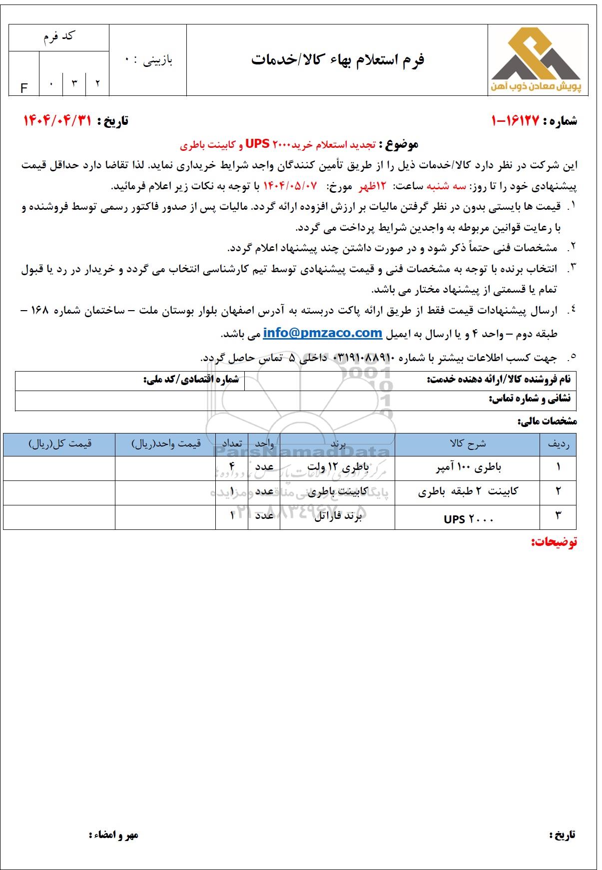 موضوع: تجدید استعلام خرید UPS 2000 و کابینت باطری