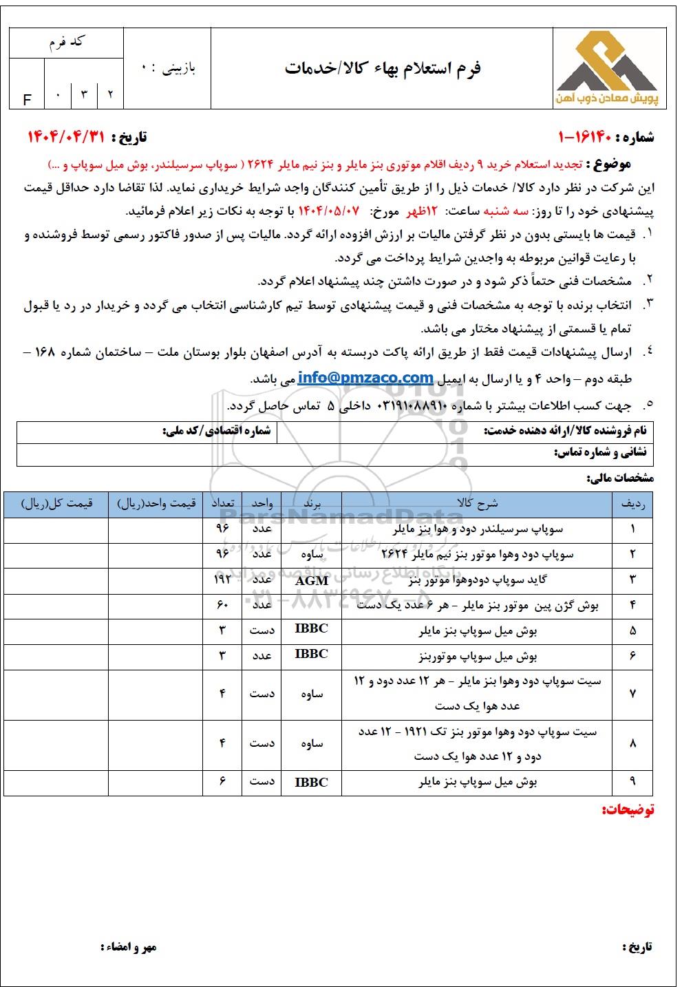 موضوع: تجدید استعلام خرید 9 ردیف اقلام موتوری بنز مایلر و بنز نیم مایلر 2624 (سوپاپ سرسیلندر، بوش میل سوپاپ و ... )
