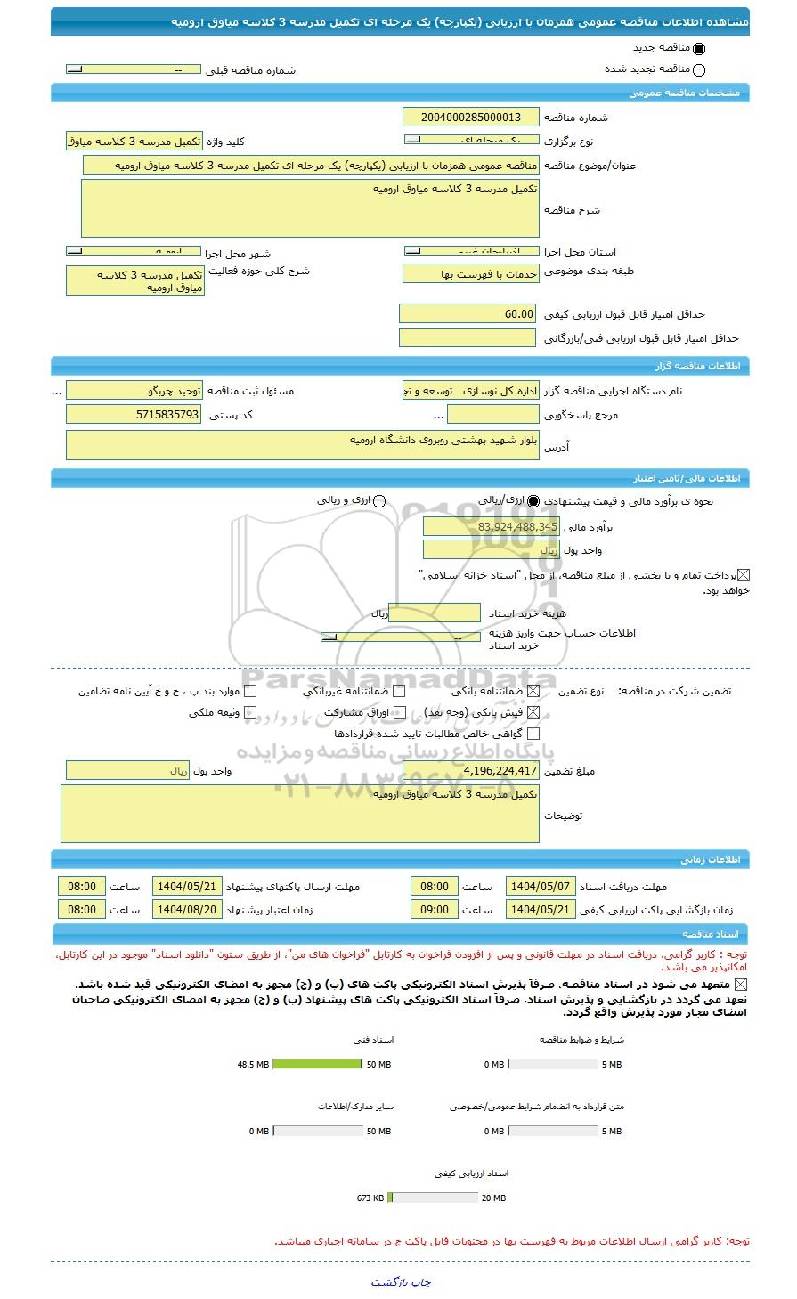 | عنوان/موضوع مناقصه | مناقصه عمومی همزمان با ارزیابی (یکپارچه) یک مرحله ای تکمیل مدرسه 3 کلاسه میاوق ارومیه | ||