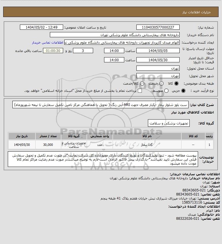 | 1 | -- | گان بیمار | عدد | تجهیزات پزشکی و سلامت | 30,000 | 1404/05/30 |