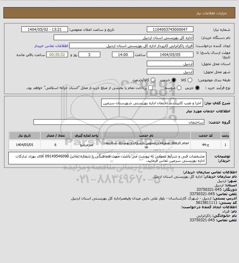 شرح کلی نیاز: اجرا و نصب کابینت ساختمان اداره بهزیستی شهرستان سرعین