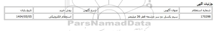 | 170298 | سیم بکسل دو سر چشمه قطر 26 میلیمتر | استعلام الکترونیکی | 1404/05/05 |