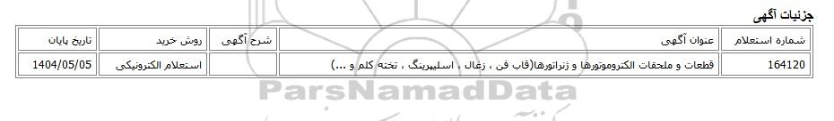 | 164120 | قطعات و ملحقات الکتروموتورها و ژنراتورها(قاب فن ، زغال ، اسلیپرینگ ، تخته کلم و ...) | استعلام الکترونیکی | 1404/05/05 |