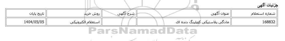 | 168832 | مادگی پلاستیکی کوپلینگ دنده ای | استعلام الکترونیکی | 1404/05/05 |