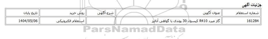 | 161284 | گاز مبرد R410 کپسول 30 پوندی با گواهی آنالیز | استعلام الکترونیکی | 1404/05/06 |