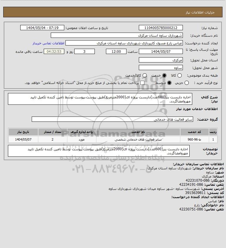 شرح کلی نیاز: اجاره داربست بنر(600عدد)داربست پروژه ای(2000مترمربع)طبق پیوست،پیوست توسط تامین کننده تکمیل تایید مهروامضاگردد.