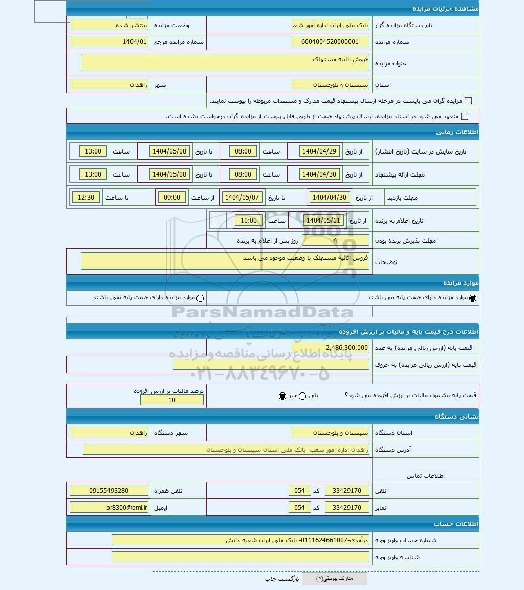 | نام دستگاه مزایده گزار | بانک ملی ایران اداره امور شعب استان سیستان وبلوچستان | وضعیت مزایده | منتشر شده | |