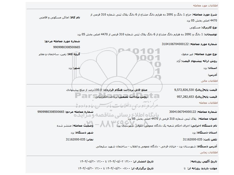 | شرح مورد معامله: حراج 1 دانگ و 2091 ده هزارم دانگ مشاع از 6 دانگ پلاک ثبتی شماره 310 فرعی از 4470 اصلی بخش 05 یزد | نام کالا: اماکن مسکونی و اقامتی | |