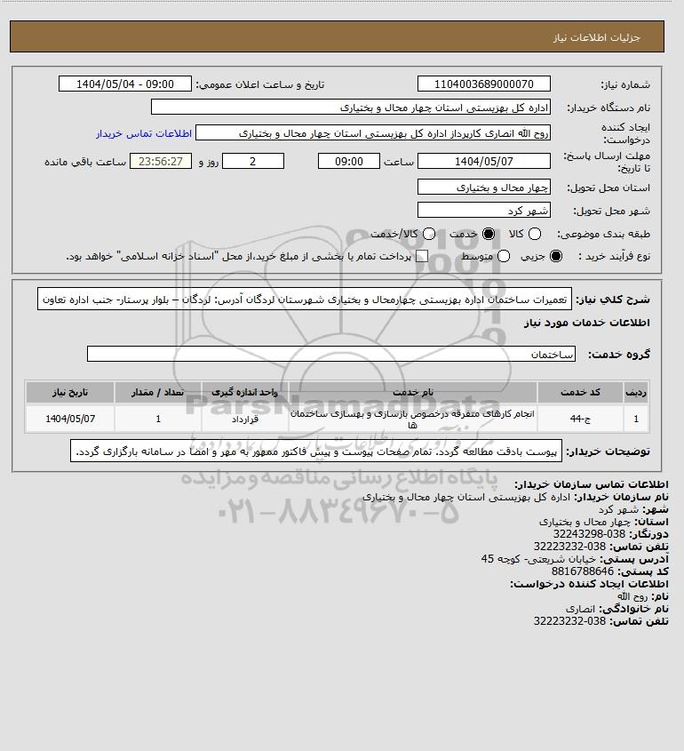 شرح کلی نیاز: تعمیرات ساختمان اداره بهزیستی چهارمحال و بختیاری شهرستان لردگان