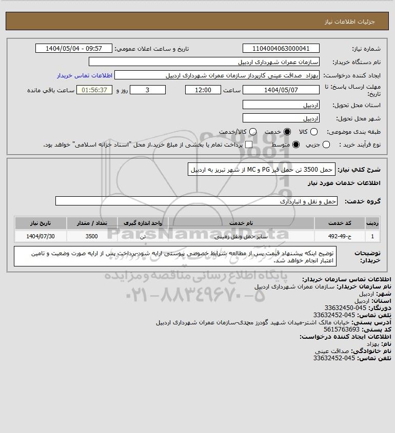 شرح کلی نیاز: حمل 3500 تن حمل قیر PG و MC از شهر تبریز به اردبیل