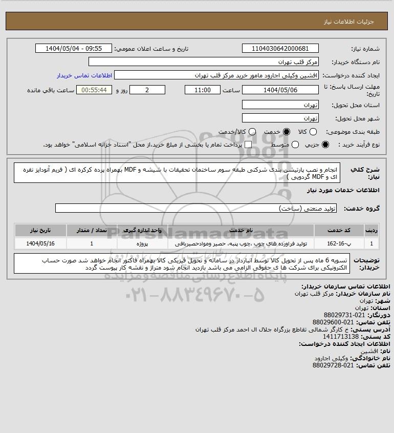 شرح کلی نیاز: انجام و نصب پارتیشن بندی شرکتی طبقه سوم ساختمان تحقیقات با شیشه و MDF بهمراه پرده کرکره ای ( فریم آنودایز نقره ای و MDF گردویی )