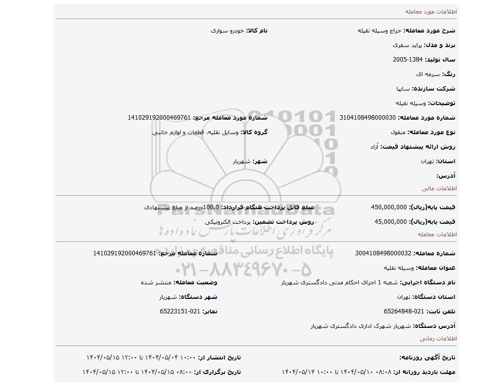 | شرح مورد معامله: حراج وسیله نقیله | نام کالا: خودرو سواری | |