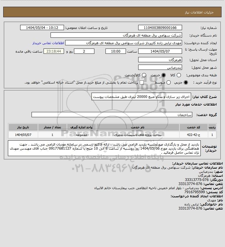 شرح کلی نیاز: اجرای زیر سازی و سکو منبع 20000 لیتری طبق مشخصات پیوست