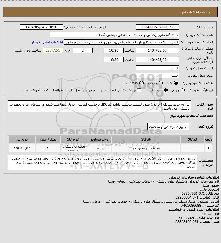 استعلام نیاز به خرید سرنگ (ایرانی) طبق لیست پیوست دارای کد IRC برچسب اصالت و تاریخ انقضا ثبت شده در سامانه اداره تجهیزات پزشکی می باشد., استعلام نیاز به خرید سرنگ (ایرانی) طبق لیست پیوست دارای کد IRC، برچسب اصالت و تاریخ انقضا ثبت شده در سامانه اداره تجهیزات پزشکی می باشد.