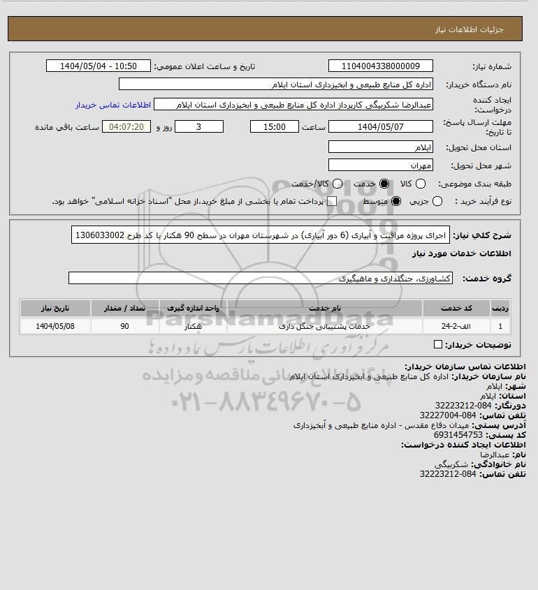 شرح کلی نیاز: اجرای پروژه مراقبت و آبیاری (6 دور آبیاری) در شهرستان مهران در سطح 90 هکتار با کد طرح 1306033002