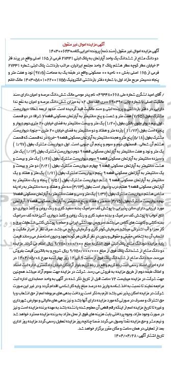 مزایده فروش دو دانگ مشاع از ششدانگ یک واحد آپارتمان به پلاک ثبتی 27331 فرعی از 165 اصلی