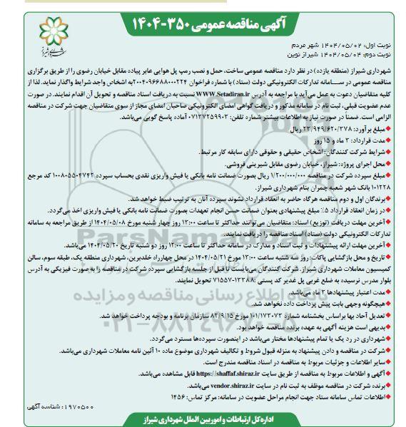 شهرداری شیراز منطقه یازده در نظر دارد مناقصه عمومی ساخت، حمل و نصب رمپ پل هوایی عابر پیاده مقابل خیابان رضوی را از طریق برگزاری مناقصه عمومی در سامانه تدارکات الکترونیکی دولت ( ستاد ) با شماره فراخوان 2004096688000224 به اشخاص واجد شرایط واگذار نماید. لذا از کلیه متقاضیان دعوت به عمل می آید با مراجعه به آدرس ستاد ایران نسبت به دریافت اسناد مناقصه و تحویل آن اقدام نمایند. در صورت عدم عضویت قبلی ، ثبت نام در سامانه مذکور و دریافت گواهی امضای الکترونیکی صاحبان امضای مجاز از سوی متقاضیان جهت شرکت در مناقصه الزامی است. ضمنا در صورت نیاز به اطلاعات بیشتر شماره تلفن: 07137259903 آماده پاسخ گویی میباشد.