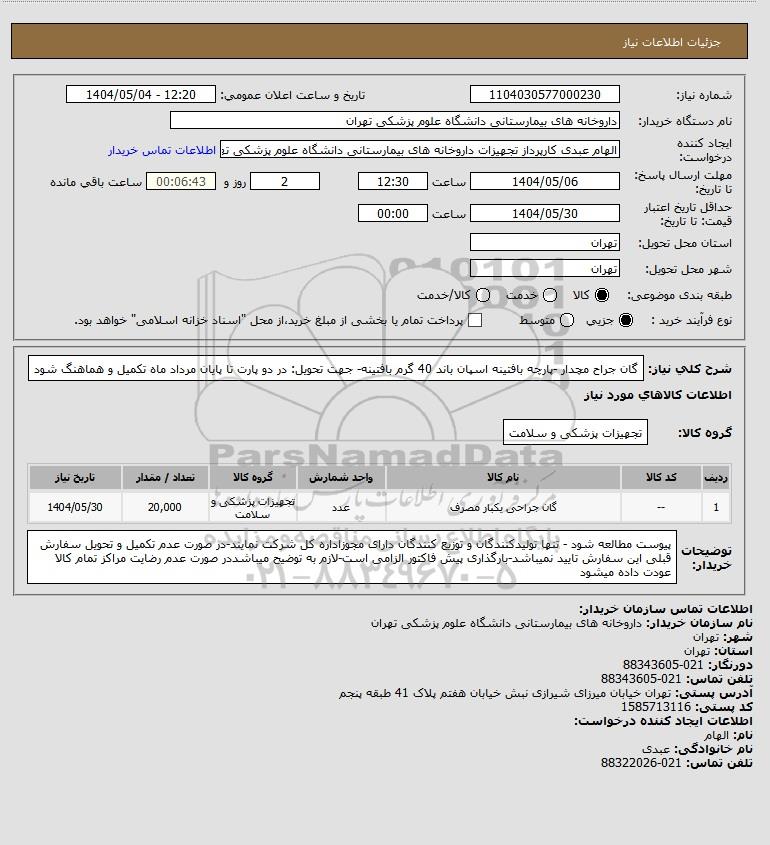 | 1 | -- | گان جراحی یکبار مصرف | عدد | تجهیزات پزشکی و سلامت | 20,000 | 1404/05/30 |