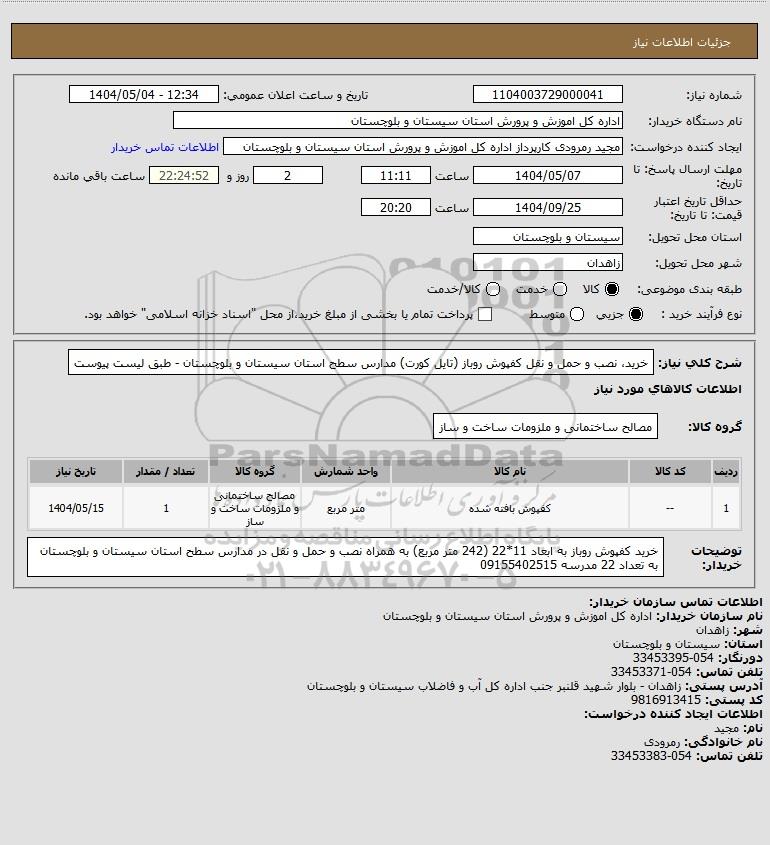 شرح کلی نیاز: خرید، نصب و حمل و نقل کفپوش روباز (تایل کورت) مدارس سطح استان سیستان و بلوچستان - طبق لیست پیوست