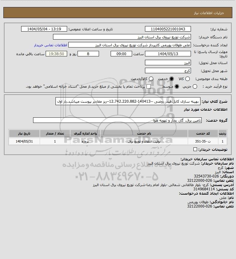 استعلام بها و موضوع استعلام استعلام بهینه سازی کابل فیدر روغنی --140413-12.742.220.882--ریز مقادیر پیوست میباشد.بار اول به اطلاع کلیه شرکتها و افراد متخصص واجد شرایط میرساند، آگهی گذار در نظر دارد از طریق استعلام بها، نسبت به انتخاب و دریافت پیشنهادات اقدام نماید. این استعلام با کد آگهی ثبت شده در سامانه خبرگزاری پارس نماد : 9320948 منتشر شده است. مشخصات استعلام : تاریخ شروع استعلام: 1404/05/04 آخرین مهلت ارسال پیشنهاد قیمت : 1404/05/13 و محل اجرای پروژه : استان البرز میباشد. استعلام قیمت مورد درخواست : استعلام بهینه سازی کابل فیدر روغنی --140413-12.742.220.882--ریز مقادیر پیوست میباشد.بار اول با دستهبندیهای تخصصی و گروه های مرتبط : پیمانکاری برق و الکترونیک, استعلام اطلاع رسانی میگردد.