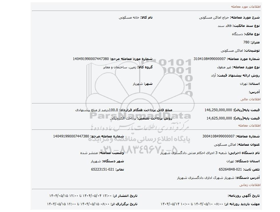 | نام دستگاه اجرایی: شعبه 3 اجرای احکام مدنی دادگستری شهریار | وضعیت معامله: منتشر شده | |