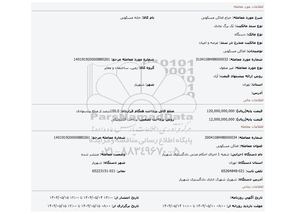 | نام دستگاه اجرایی: شعبه 1 اجرای احکام مدنی دادگستری شهریار | وضعیت معامله: منتشر شده | |