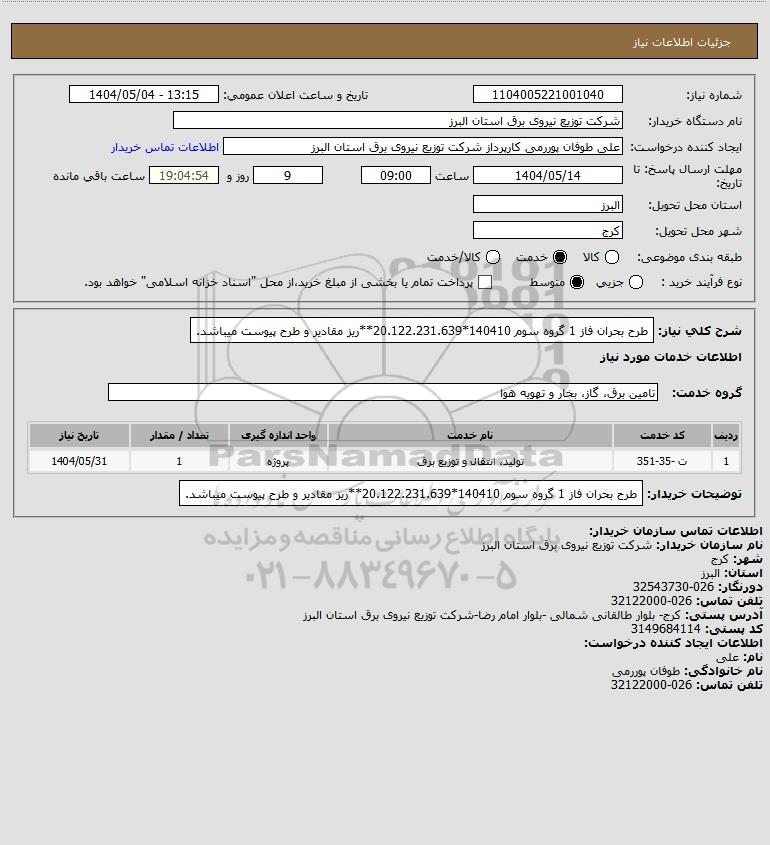 استعلام طرح بحران فاز 1 گروه سوم 140410*20.122.231.639**ریز مقادیر و طرح پیوست میباشد., استعلام طرح بحران فاز 1 گروه سوم 140410*20.122.231.639**ریز مقادیر و طرح پیوست میباشد.