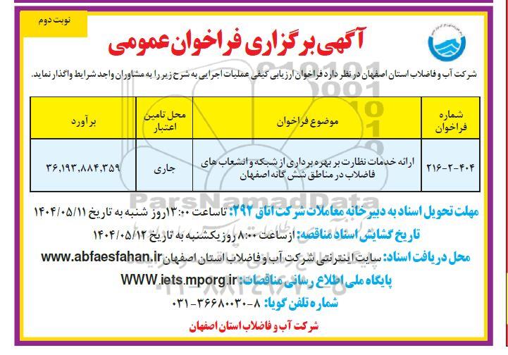 | 216-2-404 | ارائه خدمات نظارت بر بهره برداری از شبکه و انشعاب های فاضلاب در مناطق ششگانه اصفهان | جاری | 36.193.884.359 |