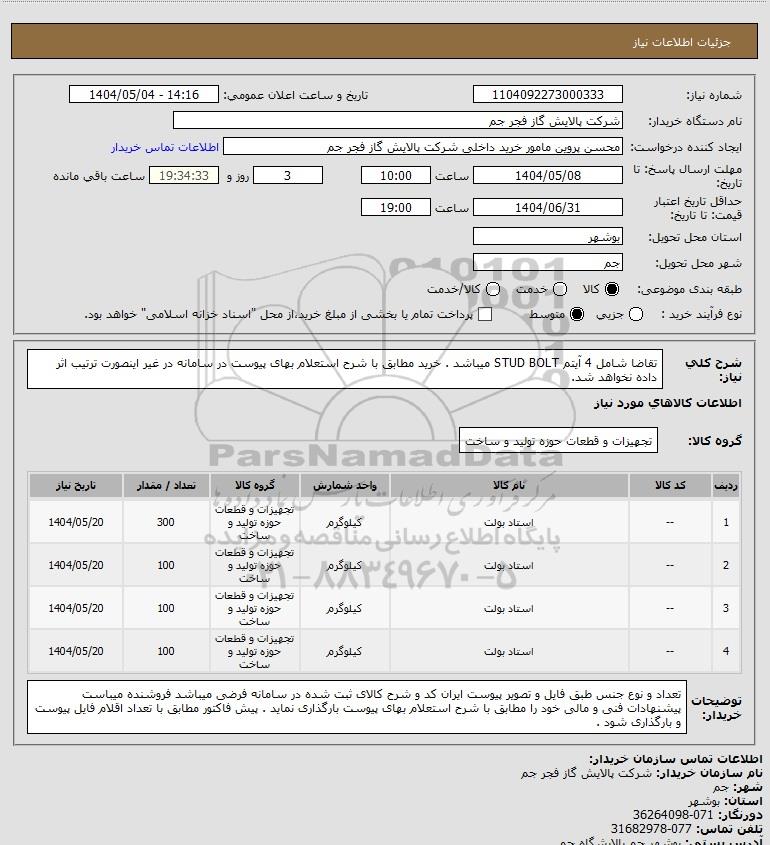 شرح کلی نیاز: تقاضا شامل 4 آیتم STUD BOLT میباشد . خرید مطابق با شرح استعلام بهای پیوست در سامانه در غیر اینصورت ترتیب اثر داده نخواهد شد.