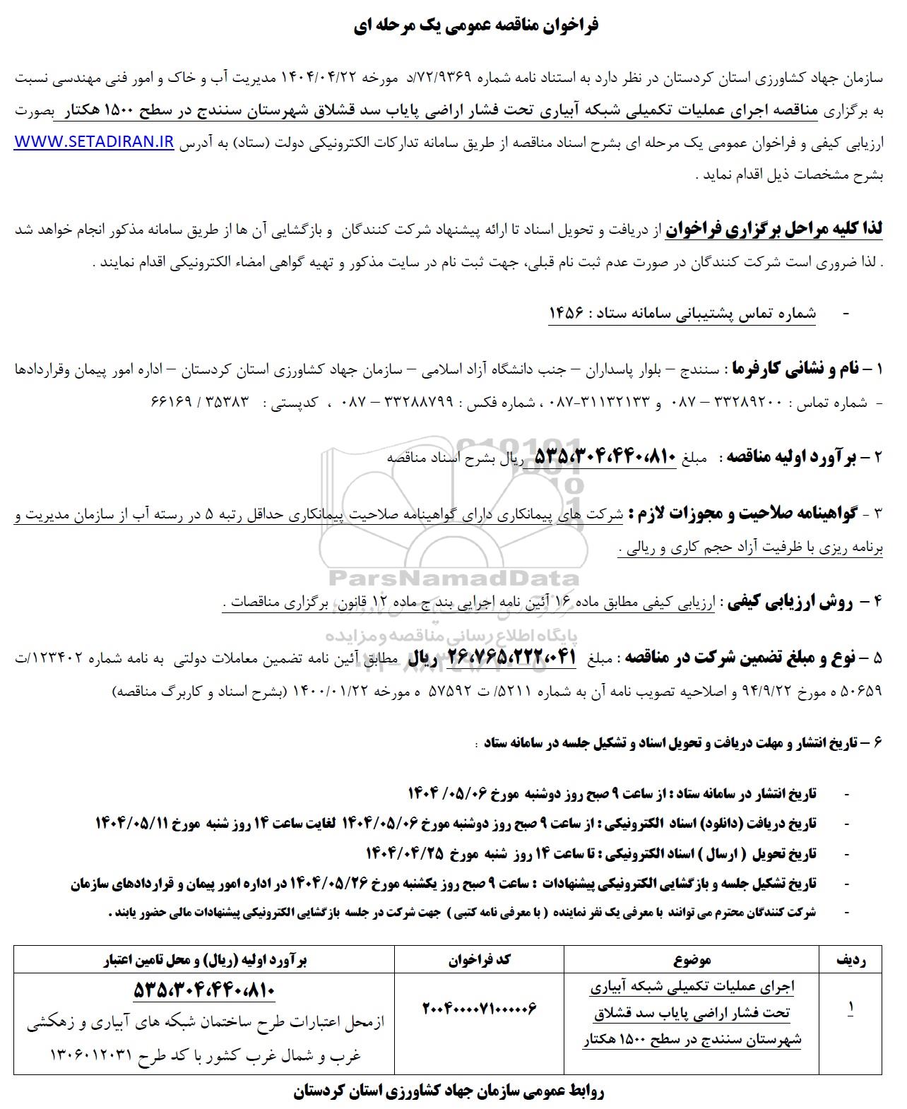 سازمان جهاد کشاورزی استان کردستان در نظر دارد به استناد نامه شماره 72/9369/ د مورخه 1404.04.22 مدیریت آب و خاک و امور فنی مهندسی نسبت به برگزاری مناقصه اجرای عملیات تکمیلی شبکه آبیاری تحت فشار اراضی پایاب سد قشلاق شهرستان سنندج در سطح 1500 هکتار به صورت ارزیابی کیفی و فراخوان عمومی یک مرحله ای به شرح اسناد مناقصه از طریق سامانه تدارکات الکترونیکی دولت (ستاد) ایران بشرح مشخصات ذیل اقدام نماید . لذا کلیه مراحل برگزاری فراخوان از دریافت و تحویل اسناد تا ارائه پیشنهاد شرکت کنندگان و بازگشایی آنها از طریق سامانه مذکور انجام خواهد شد. لذا ضروری است شرکت کنندگان در صورت عدم ثبت نام قبلی جهت ثبت نام در سایت مذکور و تهیه گواهی امضاء الکترونیکی اقدام نمایند .