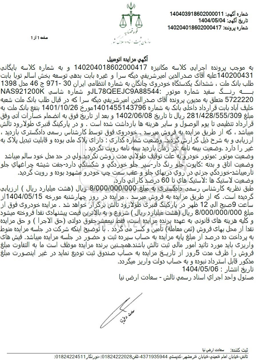 مزایده فروش ششدانگ یکدستگاه خودروی چانگان