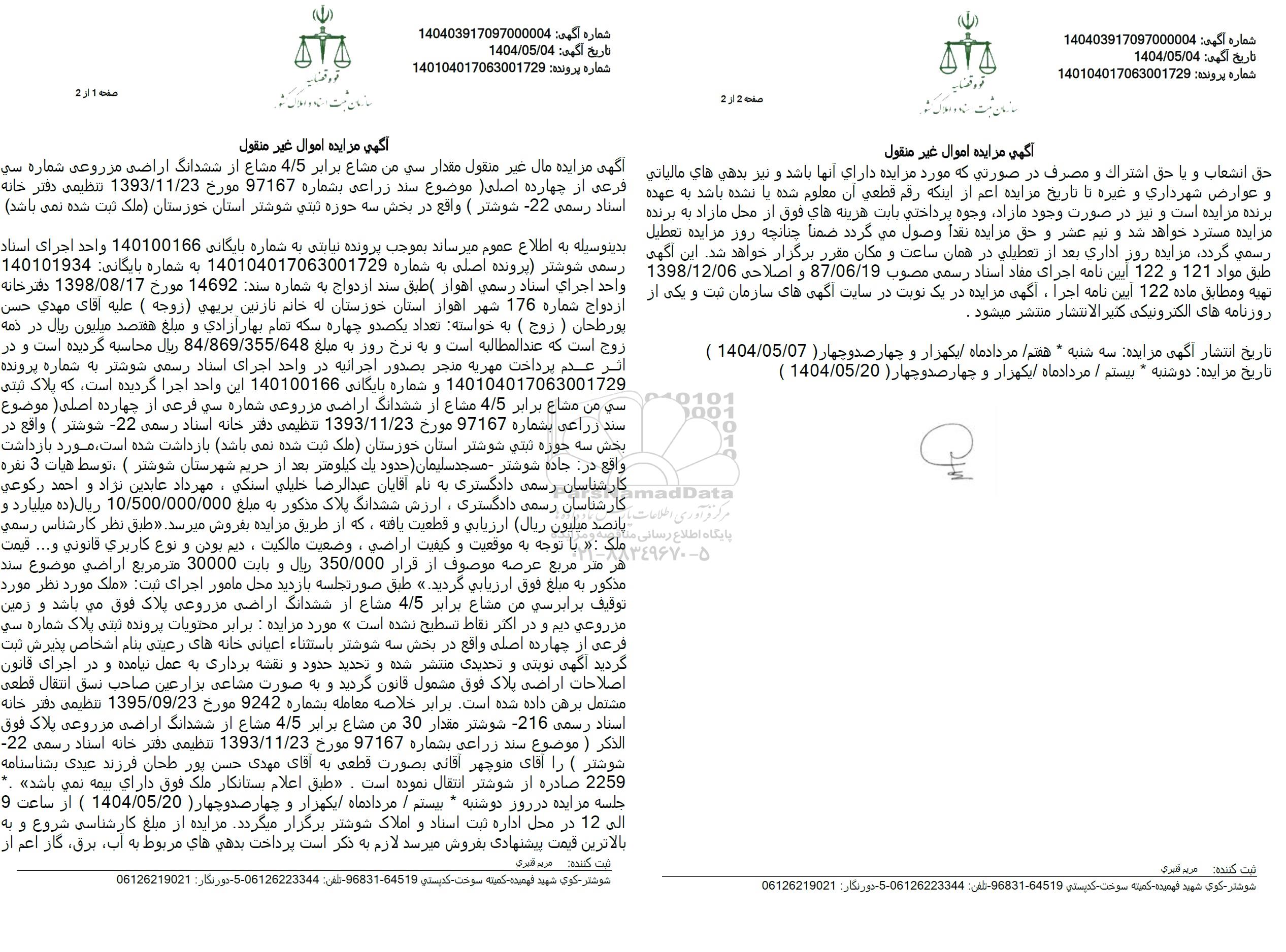 مزایده فروش یک قطعه زمین با کاربری زراعی با پلاک ثبتی 30 فرعی از 14 اصلی