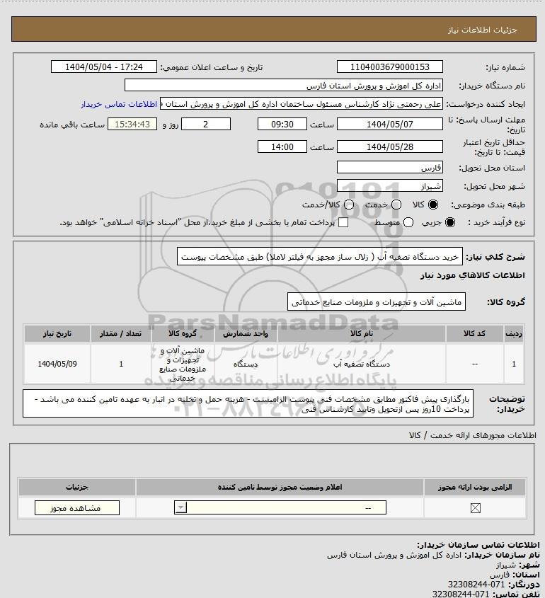 | 1 | -- | دستگاه تصفیه آب | دستگاه | ماشین آلات و تجهیزات و ملزومات صنایع خدماتی | 1 | 1404/05/09 |