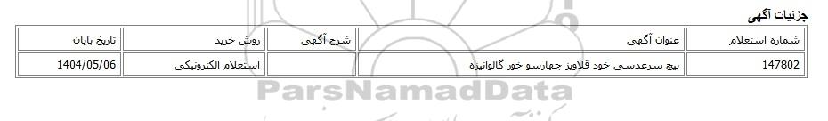 | 147802 | پیچ سرعدسی خود قلاویز چهارسو خور گالوانیزه | استعلام الکترونیکی | 1404/05/06 |