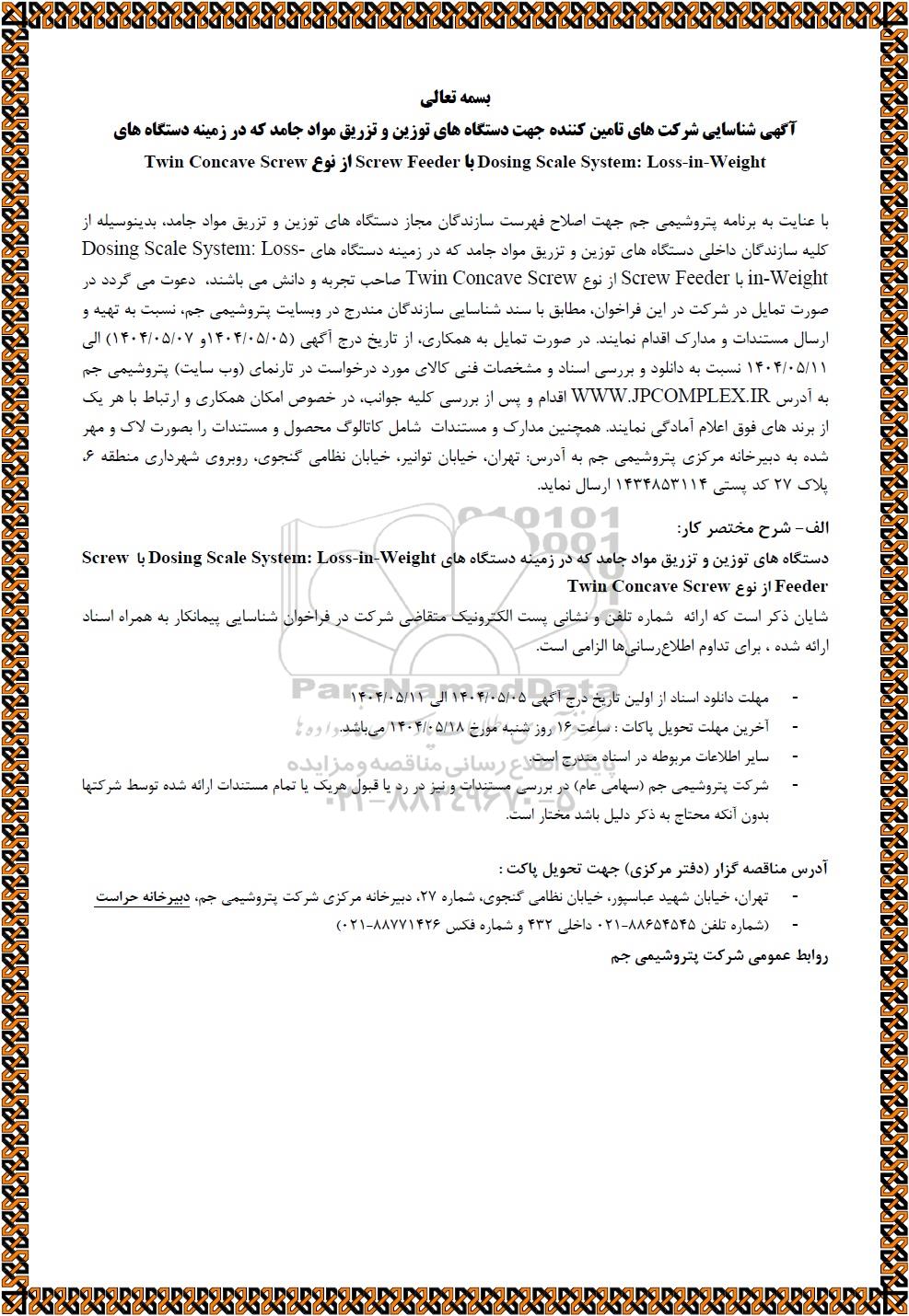 با عنایت به برنامه پتروشیمی جم جهت اصلاح فهرست سازندگان مجاز دستگاه های توزین و تزریق مواد جامد، بدینوسیله از کلیه سازندگان داخلی دستگاه های توزین و تزریق مواد جامد که در زمینه دستگاه های Dosing Scale System: Loss-in-Weight با Screw Feeder از نوع Twin Concave Screw صاحب تجربه و دانش می باشند، دعوت می گردد در صورت تمایل در شرکت در این فراخوان، مطابق با سند شناسایی سازندگان مندرج در وبسایت پتروشیمی جم، نسبت به تهیه و ارسال مستندات و مدارک اقدام نمایند. در صورت تمایل به همکاری، از تاریخ درج آگهی (1404.05.05 و 1404.05.07) الی 1404.05.11 نسبت به دانلود و بررسی اسناد و مشخصات فنی کالای مورد درخواست در تارنمای (وب سایت) پتروشیمی جم به آدرس WWW.JPCOMPLEX.IR اقدام و پس از بررسی کلیه جوانب، در خصوص امکان همکاری و ارتباط با هر یک از برند های فوق اعلام آمادگی نمایند. همچنین مدارک و مستندات شامل کاتالوگ محصول و مستندات را بصورت لاک و مهر شده به دبیرخانه مرکزی پتروشیمی جم به آدرس: تهران، خیابان توانیر، خیابان نظامی گنجوی، روبروی شهرداری منطقه 6، پلاک 27 کد پستی 1434853114 ارسال نماید.