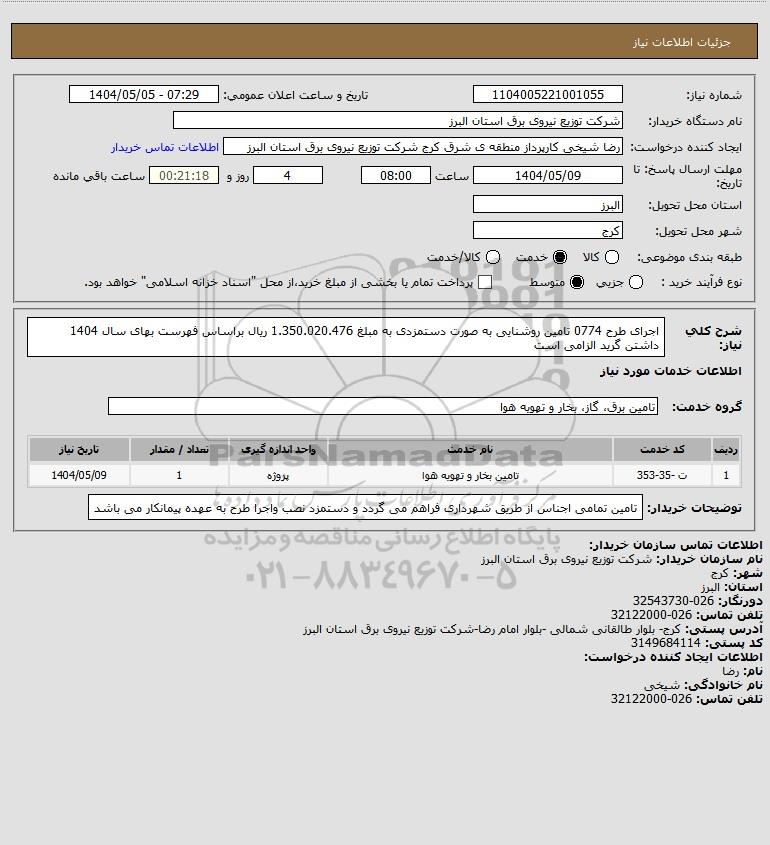 شرح کلی نیاز: اجرای طرح 0774 تامین روشنایی به صورت دستمزدی به مبلغ 1.350.020.476 ریال براساس فهرست بهای سال 1404 داشتن گرید الزامی است