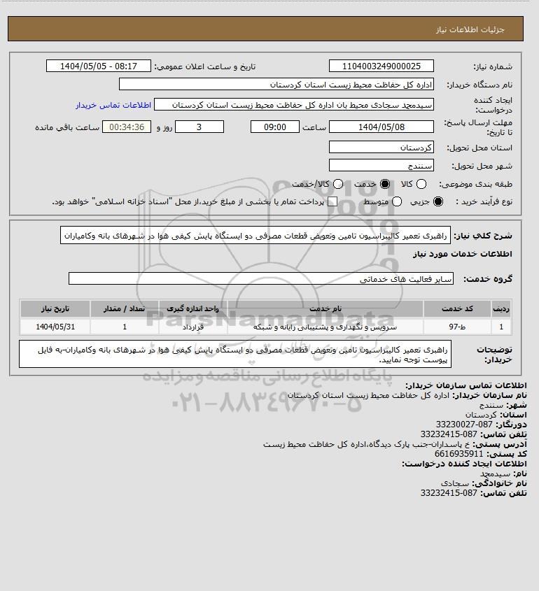 شرح کلی نیاز: راهبری تعمیر کالیبراسیون تامین وتعویض قطعات مصرفی دو ایستگاه پایش کیفی هوا در شهرهای بانه وکامیاران