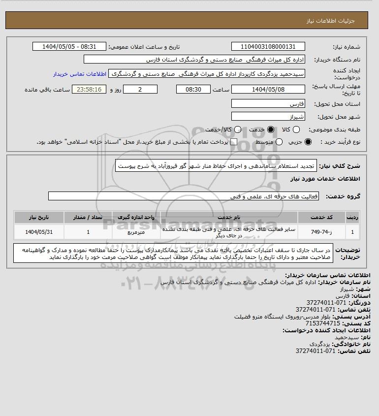 شرح کلی نیاز: تجدید استعلام ساماندهی و اجرای حفاظ منار شهر گور فیروزآباد به شرح پیوست