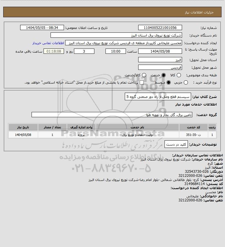 شرح کلی نیاز: سیستم قطع وصل از راه دور صنعتی گروه 5