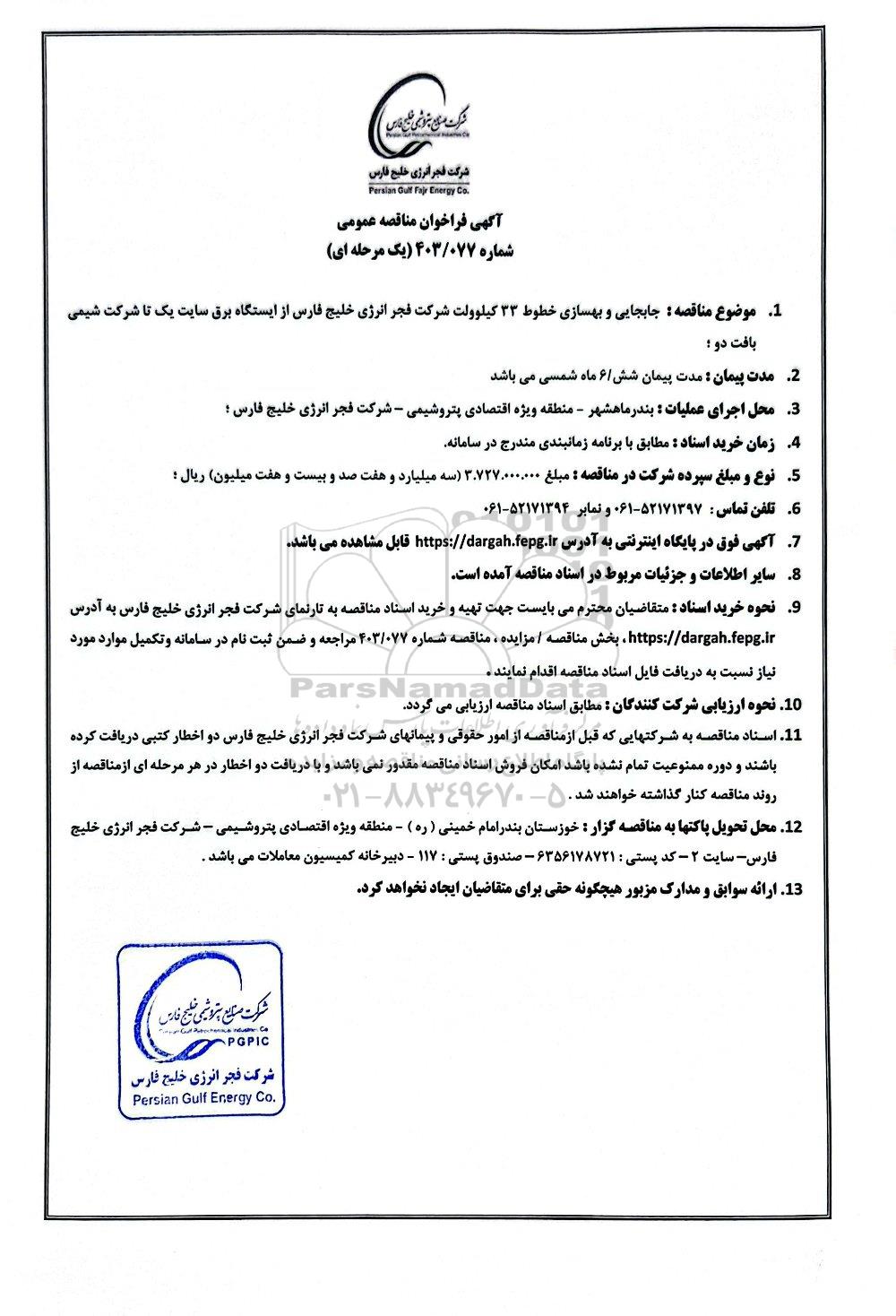 1 -موضوع مناقصه: جابجایی و بهسازی خطوط 33 کیلوولت شرکت فجر انرژی خلیج فارس از ایستگاه برق سایت یک تا شرکت شیمی بافت دو: